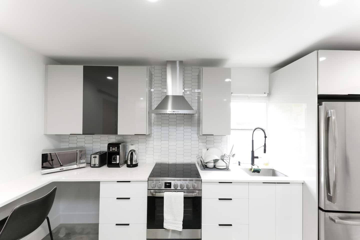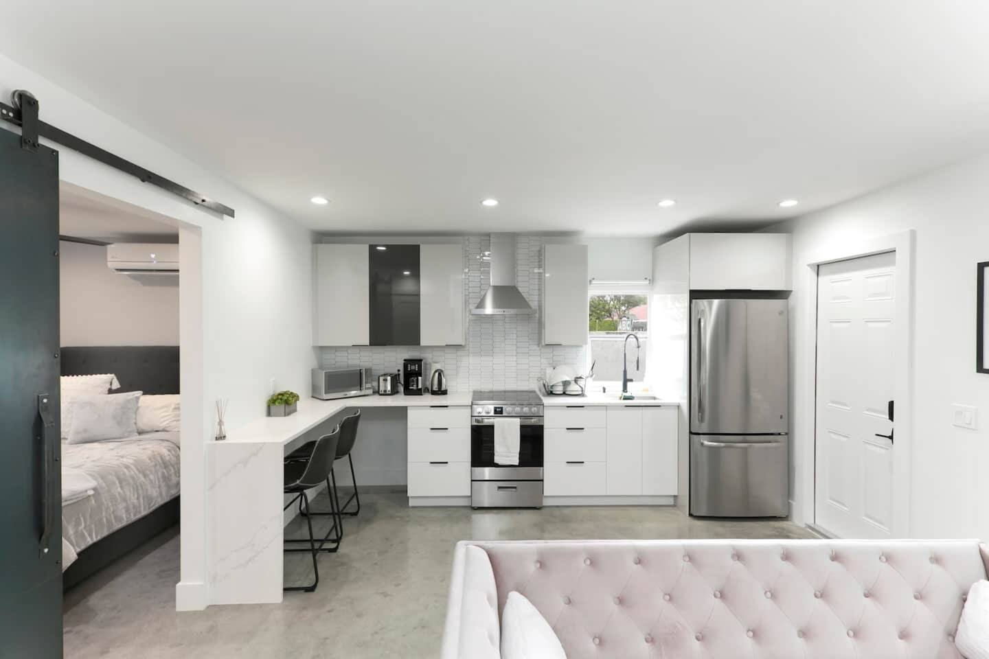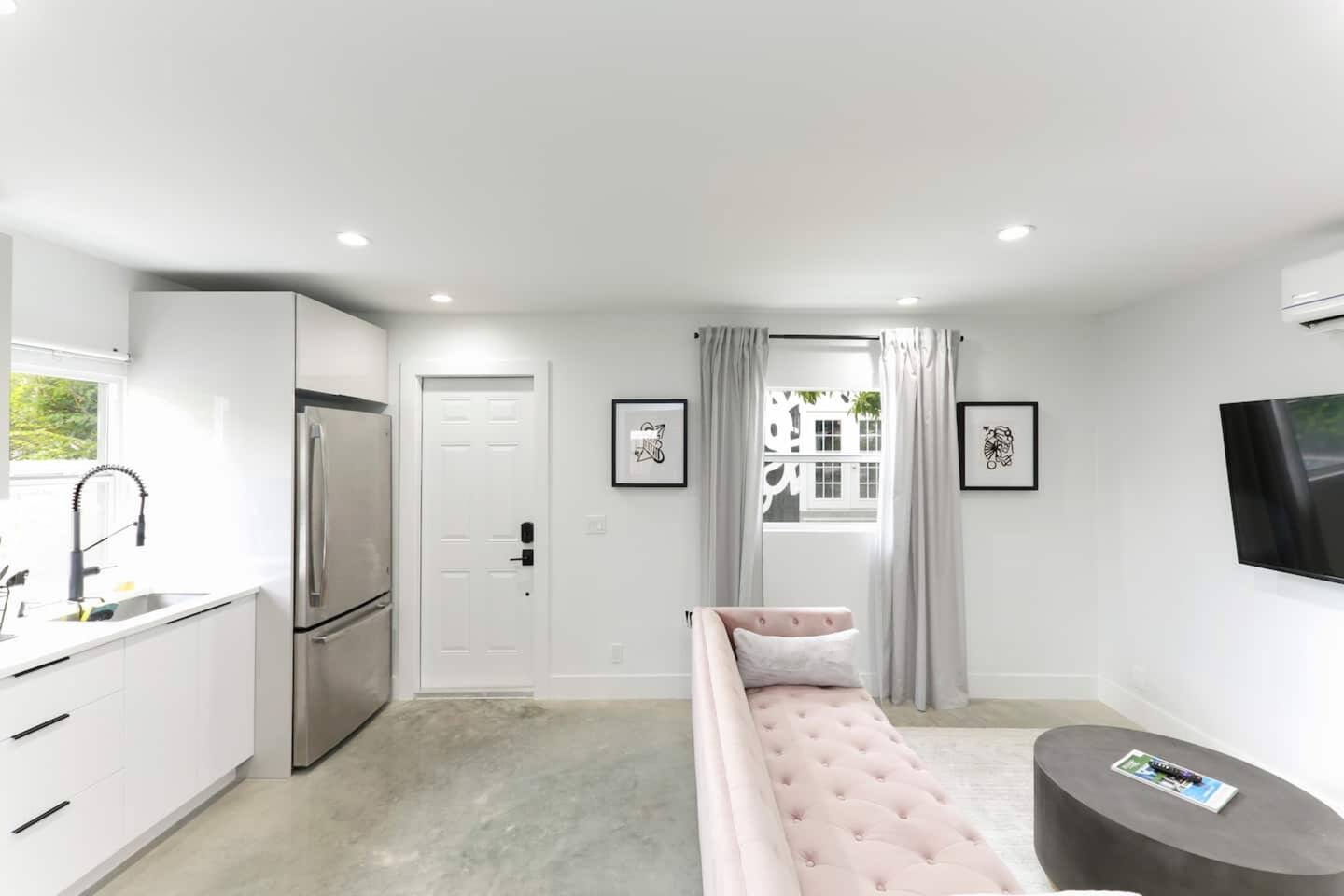 This 1-bed, 1-bath modern-art retreat sleeps 3 and delivers everything you need: ✔ This is a private guest house located on the same property as a main house rented separately. The backyard amenities and driveway parking are reserved for the main house guests. ✔ Professionally designed 450 sq ft guest house with open layout ✔ Queen bed, cozy linens, shades & ample storage ✔ 55" HDTV 📺︎ with Netflix, HBO Max, Hulu & Roku ✔ Polished concrete floors & 4-ft steel barn door ✔ Fully stocked kitchen with electric stove, oven, microwave, refrigerator, coffee bar & more ✔ Air conditioning, WiFi, and washer/dryer. Perfect for remote workers, solo adventurers, or couples looking for something different.